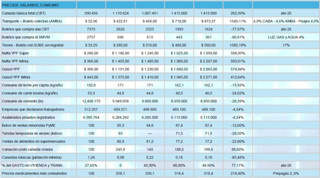 El documento señala que el principal indicador a observar es la relación entre ingresos y costo de vida, ya que permite anticipar el comportamiento del consumo y la producción. En ese sentido, la capacidad de compra se redujo de manera significativa: la cantidad de boletos de transporte que puede adquirir una canasta básica cayó 77,97%, mientras que en el caso del salario mínimo la reducción alcanza el 86,91%.
